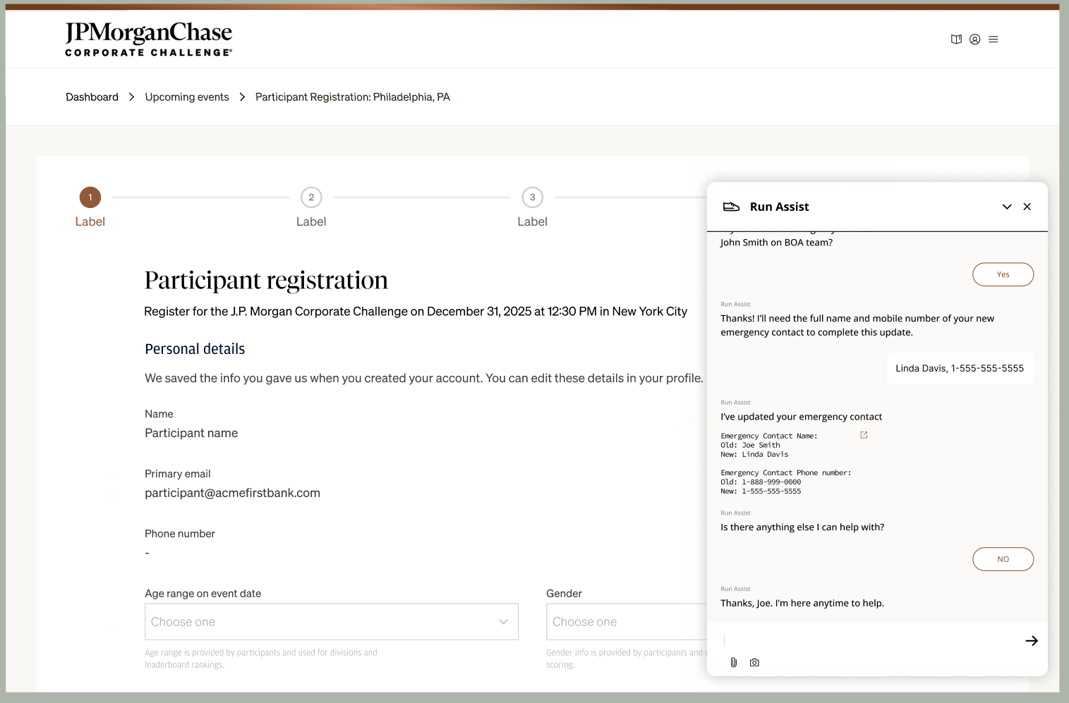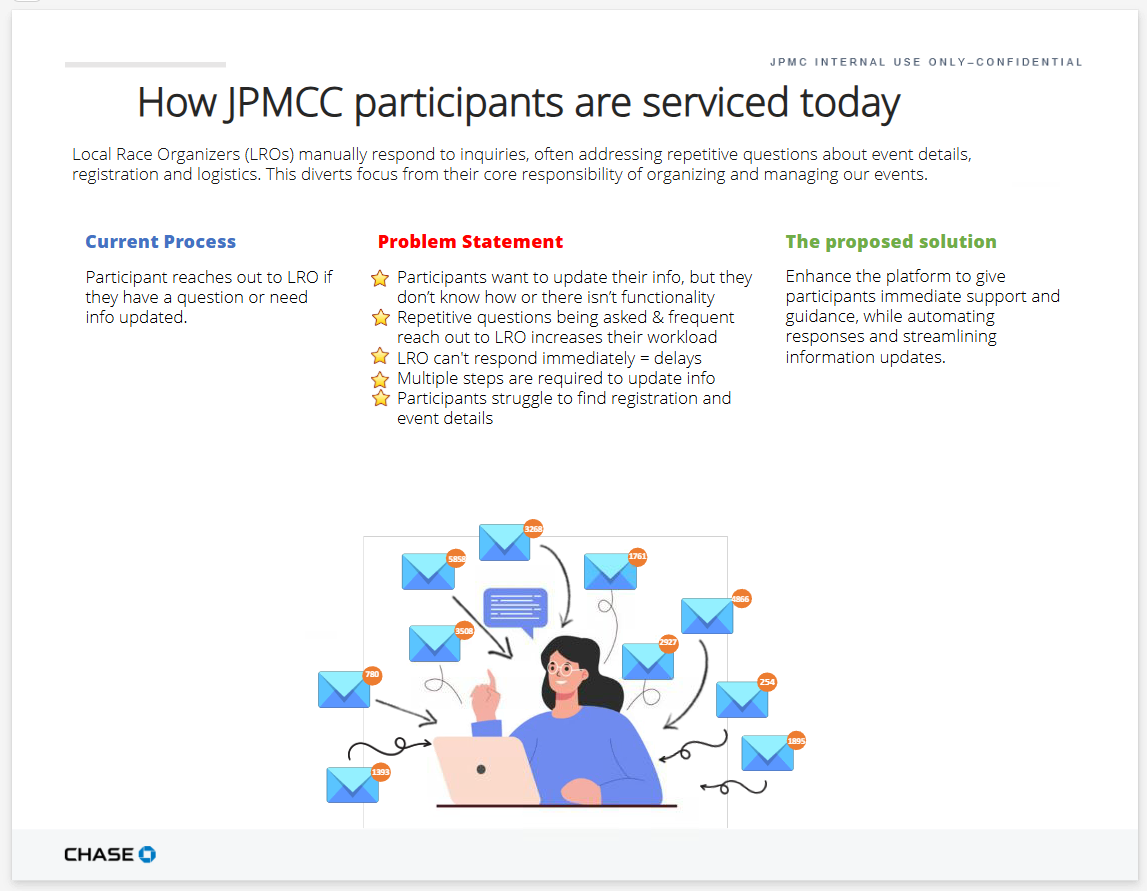 SOLUTION – Run Assist introduced an AI-powered companion within the event ecosystem. It guided runners through training schedules, race-day logistics, and post-run stats using conversational interactions. The prototype boosted engagement by 18% in pilot testing and set the foundation for future AI integration across Chase wellness initiatives.