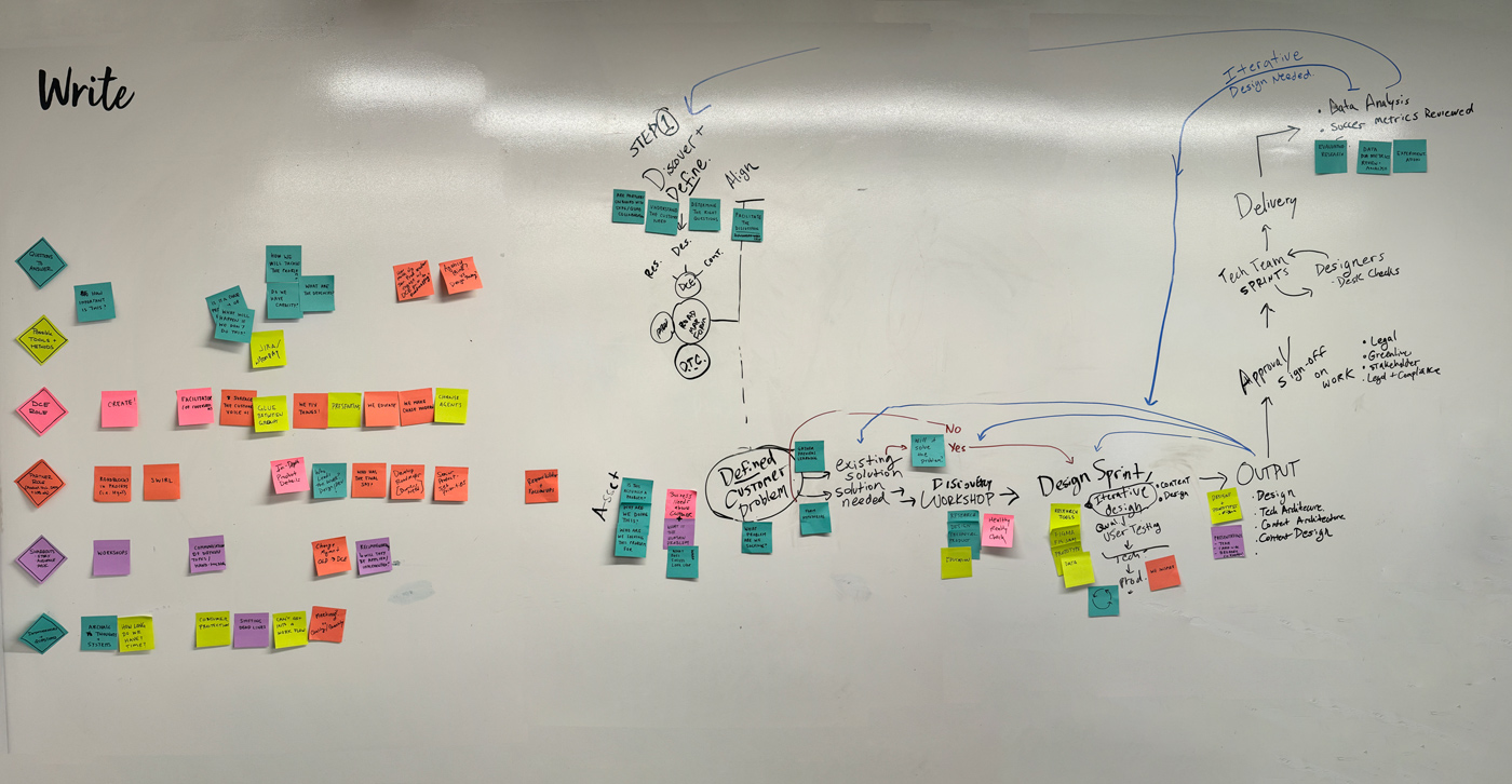 Building upon what we learned through our partners in marketing and our interviews with technology and the various employees we talked with about pain points in their current processes, we were able to develop and iterate service blueprints.